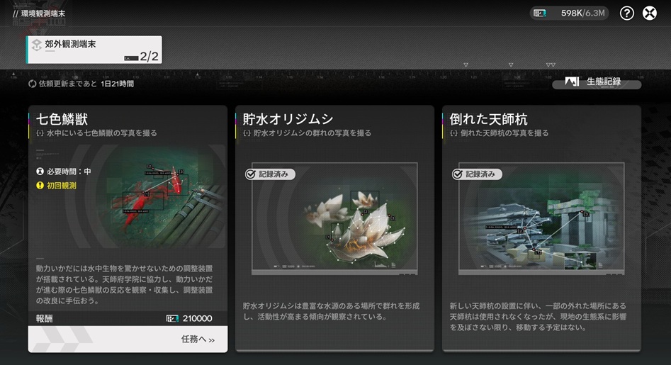 エンドフィールドの武陵の郊外観測端末ミッション「水中にいる七色鱗獣の写真を撮る」任務の画像